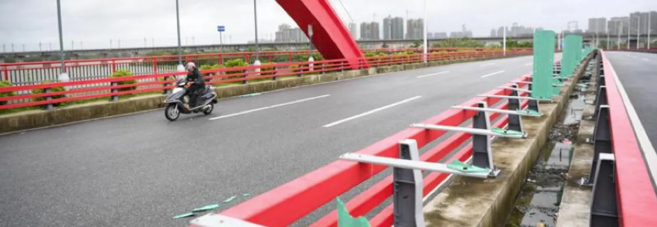 چین کے جنوبی صوبہ گوانگ ڈونگ کے شہر یانگ جیانگ میں سمندری طوفان ما آن کے باعث ایک پل پر تباہ شدہ حفاظتی رکاوٹوں کا ایک منظر ۔(شِنہوا)