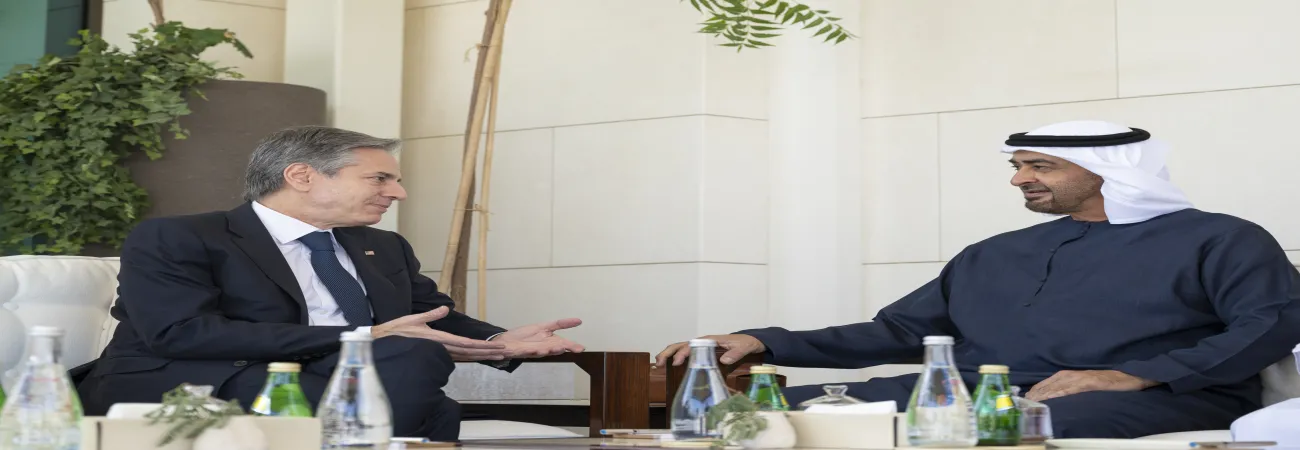 متحدہ عرب امارات  کے صدر شیخ محمد بن زاید النہیان  ابوظہبی میں امریکی وزیر خارجہ انتھونی بلنکن سے ملاقات کرتے ہوئے۔(شِنہوا)