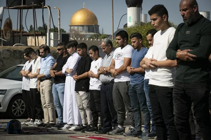 بیت المقدس  کے پرانے شہر میں مسجد اقصیٰ میں نماز جمعہ ادا کرنے کی اجازت نہ ملنے کی وجہ سے مسلمان سڑک پر نماز ادا کر رہے ہیں۔ (شِنہوا)