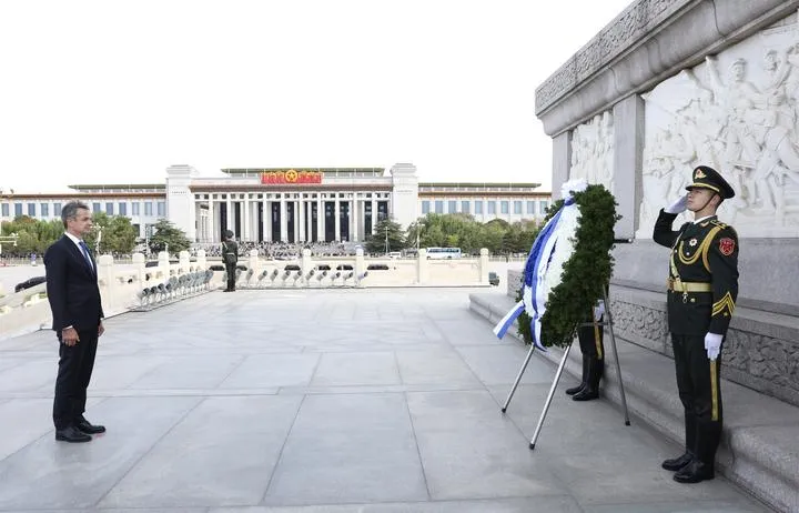یونانی وزیراعظم کیریاکوس میتسوتاکس دارالحکومت بیجنگ کے تیان آن من اسکوائر میں عوامی ہیروز کی یادگار پر پھول چڑھا رہے ہیں۔(شِنہوا)