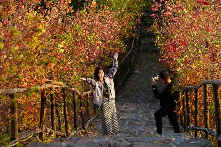 چین، شمالی صوبہ ہیبے کے شہر شی جیا ژوآنگ کے ضلع لوچھوان کے ایک خوبصورت مقام پر ایک خاتون سیاح کا تصاویر کے لئے انداز ۔ (شِںہوا)