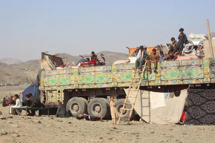افغانستان ، صوبہ ننگرہار میں طورخم سرحدی مقام پر افغان مہاجرین ایک ٹرک میں آرام کر رہے ہیں۔ (شِںہوا)