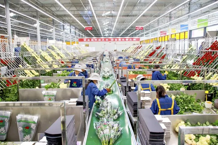 چین ، شمال مغربی صوبے گانسو کے لین شیا ہوئی خود اختیار پریفیکچر میں لین شیا یی نوگ ایگریکلچر اینڈ اینیمل ہسبنڈری انویسٹمنٹ کمپنی لمیٹڈ کی فیکٹری میں عملہ گلاب  پیک کررہا ہے۔ (شِنہوا)