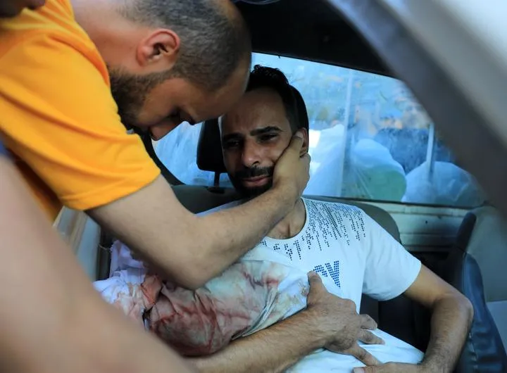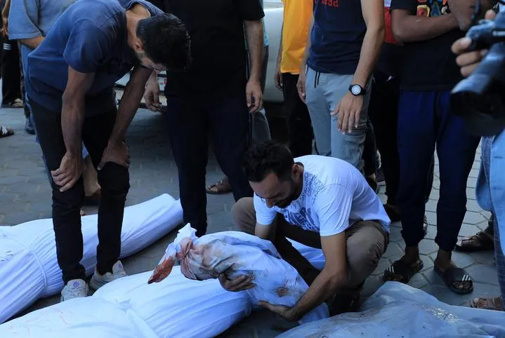 وسطی غزہ کی پٹی کے دیر البلاح شہر کے الاقصی شہداء ہسپتال کے ایک طبی مرکز میں فلسطینی اپنے رشتہ داروں کے جاں بحق ہونے پرغمزدہ ہیں۔(شِنہوا)