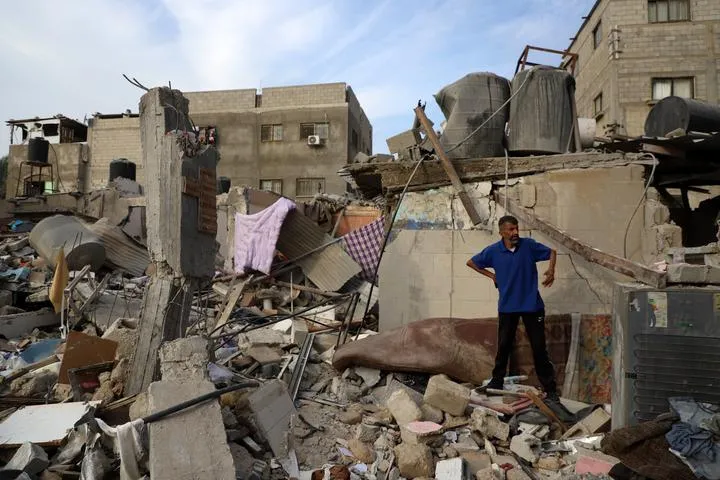 غزہ کی پٹی کے جنوبی شہر خان یونس میں اسرائیلی فضائی حملوں میں تباہ ہونے والی عمارتوں کے ملبے کے درمیان ایک شخص نظر آ رہا ہے۔(شِنہوا)