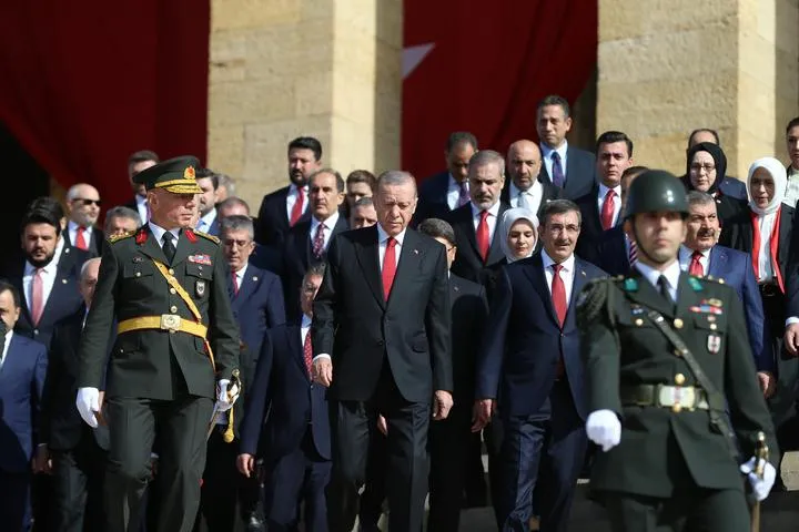 ترکیہ کےصدررجب طیب ایردوان (درمیان) انقرہ میں ملک کے قیام کی 100 ویں سالگرہ کے موقع پر منعقدہ تقریبات کے دوران جمہوریہ ترکیہ کے بانی مصطفیٰ کمال اتاترک کے مزارپرحاضری دے رہے ہیں۔(شِنہوا)