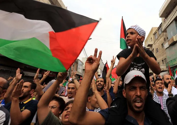 اردن کے شہر عمان میں فلسطینیوں سے حمایت کے اظہار کے لیے لوگ احتجاج میں شریک ہیں۔(شِنہوا)