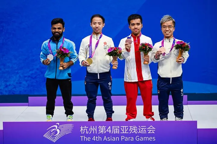چین کے مشرقی صوبہ ژی جیانگ کے شہر ہانگژو میں چوتھے ایشین پیرا گیمز میں مردوں کےبیڈمنٹن سنگلزایس ایچ6 مقابلے میں طلائی تمغہ جیتنے والے چینی ہانگ کانگ کےکھلاڑی چھو مان کائی (بائیں جانب سے دوسرے)، چاندی کا تمغہ جیتنے والے بھارتی کھلاڑی کرشنا نگر (بائیں جانب پہلے)، کانسی کا تمغہ جیتنے والے چینی کھلاڑی لِن نائلی (دائیں جانب دوسرے) اورچینی ہانگ کانگ کے وونگ چھون یم  ایوارڈتقریب کے دوران تصویربنوارہے ہیں۔(شِنہوا)