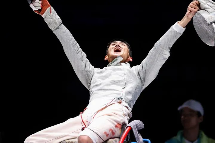 چین ، مشرقی صوبے ژے جیانگ کے شہر ہانگ ژو میں چوتھے ایشیئن پیرا گیمز میں وہیل چیئر فینسنگ کے مردوں کی سبرے انفرادی کیٹگری اے میں طلائی تمغہ جیتنے کے بعد چین کے تیان جیان چھوان جشن منارہے ہیں۔ (شِنہوا)