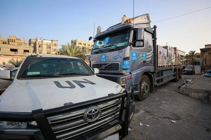 غزہ کی پٹی کے جنوبی شہر خان یونس میں رفاہ سرحد سے غزہ میں داخل ہونے والا امدادی سامان سے لدا ٹرک دیکھا جاسکتا ہے۔ (شِنہوا)
