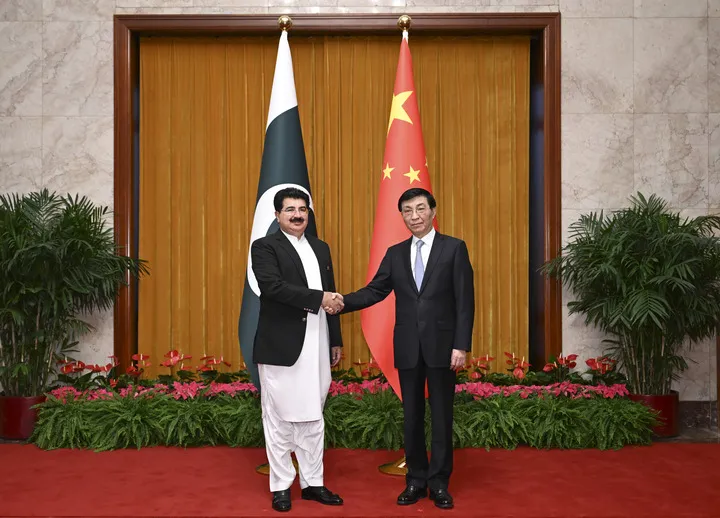 چین کی عوامی سیاسی مشاورتی کانفرنس (سی پی پی سی سی ) کی قومی کمیٹی کے چیئرمین وانگ ہوننگ بیجنگ میں پاکستانی سینیٹ کے چیئرمین صادق سنجرانی سے ملاقات کے دوران مصافحہ کر رہے ہیں۔(شِنہوا)