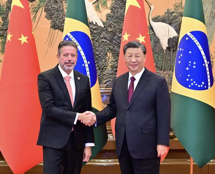 چینی صدر اور کمیونسٹ پارٹی آف چائنہ کی مرکزی کمیٹی کے جنرل سکریٹری شی جن پھنگ بیجنگ کے عظیم عوامی ہال میں برازیل کے چیمبر آف ڈیپیوٹیزکے صدر آرتھر لیرا سے ملاقات کے دوران مصافحہ کر رہے ہیں۔(شِنہوا)
