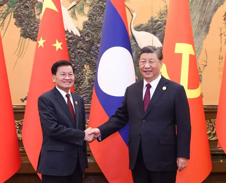 چینی صدر اور کمیونسٹ پارٹی آف چائنہ کی مرکزی کمیٹی کے جنرل سکریٹری شی جن پھنگ بیجنگ کے عظیم عوامی ہال میں لاؤس کی عوامی انقلابی پارٹی کی مرکزی کمیٹی کے جنرل سیکرٹری اور لاؤس کے صدر تھونگلون سیسولتھ سے ملاقات کے دوران مصافحہ کررہے ہیں۔(شِنہوا)