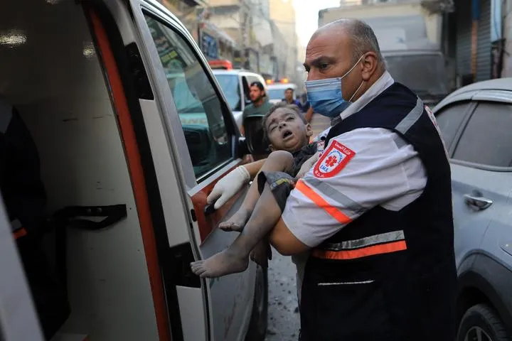 غزہ کی پٹی کے جنوبی شہر خان یونس میں اسرائیلی حملوں سے زخمی ایک بچے کو عملہ کا ایک رکن منتقل کررہا ہے۔ (شِںہوا)