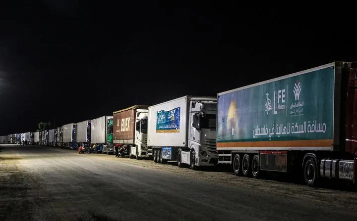 مصر، رفاہ سرحد کے قریب امدادی سامان سے لدے ٹرک غزہ میں داخل ہونے کے منتظر ہیں۔ (شِنہوا)
