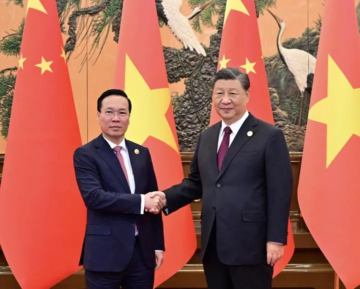 چینی صدر اور کمیونسٹ پارٹی آف چائنہ کی مرکزی کمیٹی کے جنرل سکریٹری شی جن پھنگ بیجنگ کے عظیم عوامی ہال میں ویتنام کے صدر وو وان تھونگ سے ملاقات کے دوران مصافحہ کررہے ہیں۔(شِنہوا)