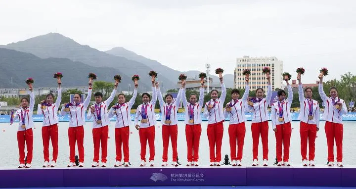 چین ، مشرقی صوبے ژے جیانگ کے شہر ہانگ ژو میں جاری 19 ویں ایشیائی کھیلوں میں خواتین کی ڈریگن کشتی ایک ہزار میٹر ریس میں طلائی تمغہ جیتنے والی چینی ٹیم خوشی کا اظہار کر رہی ہے۔ (شِنہوا)