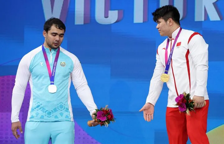 چین کے صوبہ ژے جیانگ کے شہر ہانگ ژومیں 19ویں ایشین گیمز میں مردوں کے ویٹ لفٹنگ کے 109 کلوگرام کیٹگری میں سونے کا تمغہ جیتنے والے چینی لیو ہوان ہوا (دائیں) اور چاندی کا تمغہ حاصل کرنے والے ازبکستان کے اکبر جورایف ایوارڈ  تقریب میں شریک ہیں۔(شِنہوا)