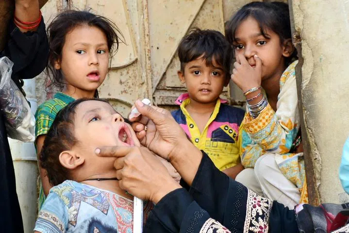 حیدرآباد میں پولیو ویکسین پلانے کی مہم کے دوران ایک طبی کارکن ایک بچے کو ویکسین کی خوراک دے رہی ہے۔ (شِنہوا)