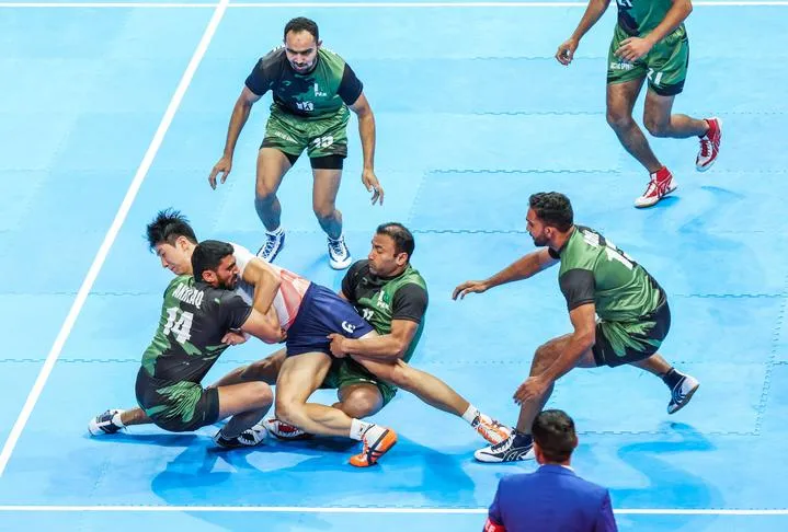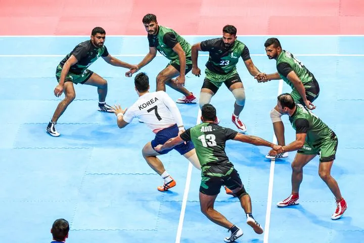 چین، مشرقی صوبے ژے جیانگ کے شہر ہانگ ژو میں جاری 19 ویں ایشیائی کھیلوں میں مردوں کے کبڈی مقابلے میں گروپ بی کے ایک میچ میں پاکستان اور جنوبی کوریا کے کھلاڑی مدمقابل ہیں۔(شِنہوا)