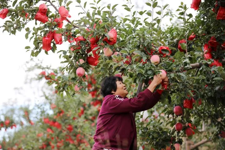 چین کے صوبہ گانسو کی جینگ ننگ کاؤنٹی کے ہوشان گاؤں میں ایک خاتون کسان باغ میں سیب کی نشوونما کا جائزہ لے رہی ہے۔(شِنہوا)