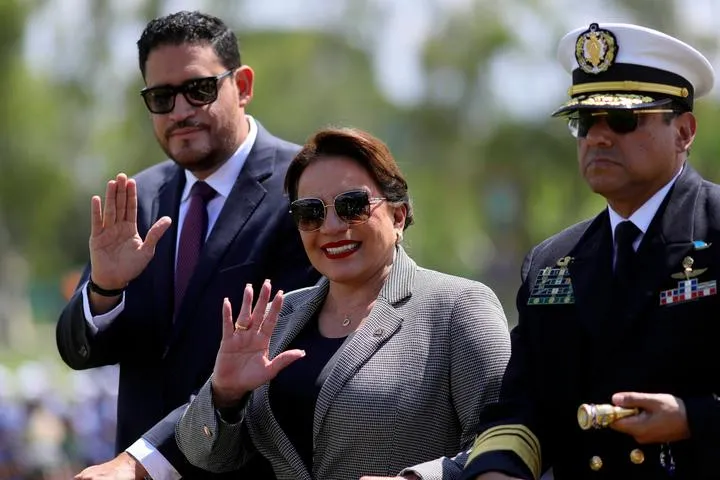 جمہوریہ ہونڈوراس کی صدر ایرس زیومارا کاسٹرو سارمینٹو (درمیان )ٹیگوسیگالپا میں ہنڈوران سولجرز ڈے کی تقریب میں شریک ہیں۔(شِنہوا)