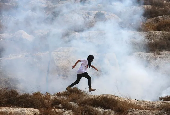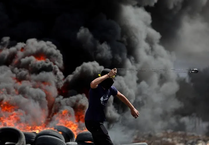 نابلس کے قریب مغربی کنارے کے گاؤں کفر قدوم میں یہودی بستیوں کی توسیع کے خلاف احتجاج کے بعد جھڑپوں کےدوران  فلسطینی مظاہرین میں سے ایک شخص اسرائیلی فوجیوں پر پتھراؤکے لیے غلیل کا استعمال کر رہا ہے۔(شِنہوا)