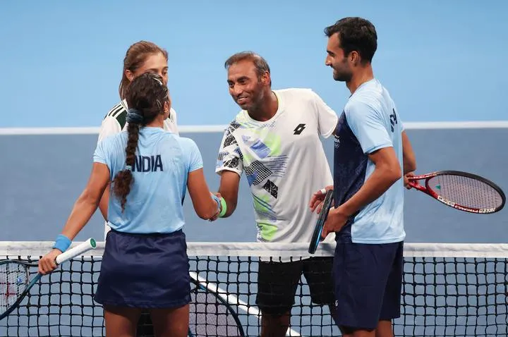 چین کے شہر ہانگژو میں  ایشین گیمز میں مکسڈ ڈبلز ٹینس کے دوسرے راؤنڈ میں پاکستان کے اعصام الحق قریشی اپنی ساتھی کھلاڑی  اشنا سہیل سے ہاتھ ملاتے ہوئے۔