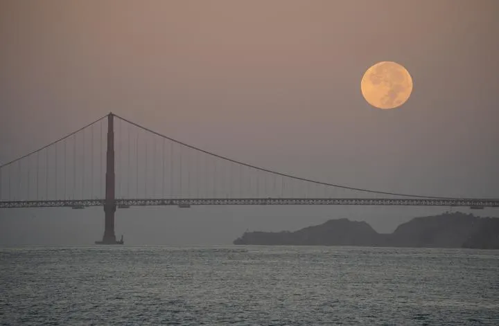 امریکہ کی  ریاست سان فرانسسکومیں گولڈن گیٹ برج پر پورے چاندکا منظر۔(شِنہوا)