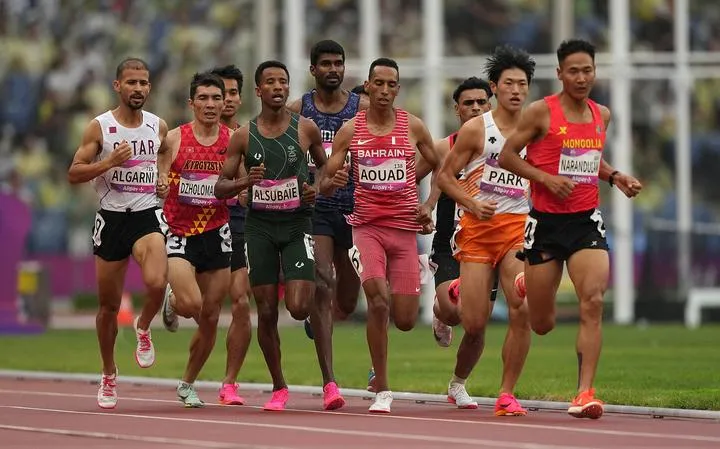 چین کے مشرقی صوبہ ژی جیانگ کے شہر ہانگژومیں 19ویں ایشین گیمزمیں  مردوں کے  1500 میٹر ہیٹ آف ایتھلیٹکس کے دوران ایتھلیٹس مقابلہ کر رہے ہیں۔(شِنہوا)
