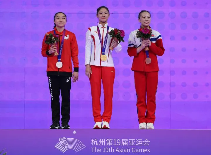 چین کے مشرقی صوبہ ژی جیانگ کے شہر ہانگ ژو میں جاری19ویں ایشین گیمزمیں خواتین کے آرٹسٹک جمناسٹک کے آل راؤنڈ فائنل میں طلائی تمغہ جیتنے والی چین کی کھلاڑی ژوو تونگ (درمیان)، چاندی کا تمغہ جیتنے والی جاپانی اوکامورا مانا (بائیں) اور کانسی کا تمغہ جیتنے والی عوامی جمہوریہ کوریا (ڈی پی آر کے) کی کھلاڑی  کِم سوجونگ ایوارڈ تقریب میں شریک ہیں۔(شِنہوا)