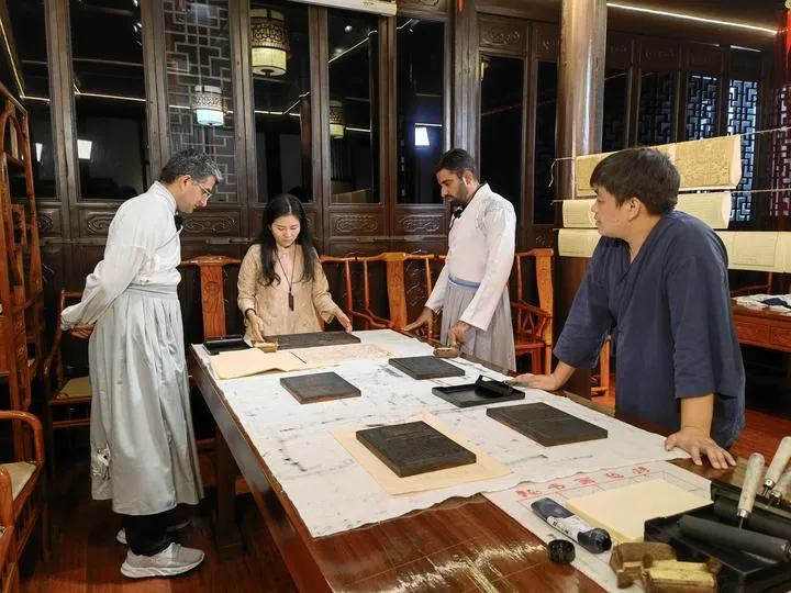جوزف (دائیں سے دوسرے) اور علی (بائیں سے پہلے) روایتی چینی پرنٹنگ دیکھتے ہوئے۔(شِنہوا)