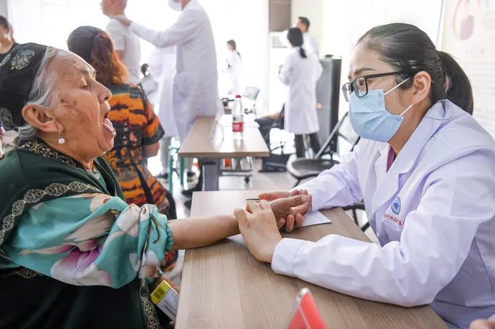 چین کےمشرقی صوبہ شان ڈونگ سے تعلق رکھنے والی ایک طبی کارکن  شمال مغربی سنکیانگ ویغور خود مختار علاقے کے کاشغرمیں مریضہ کا مفت علاج کر رہی ہے۔(شِنہوا)