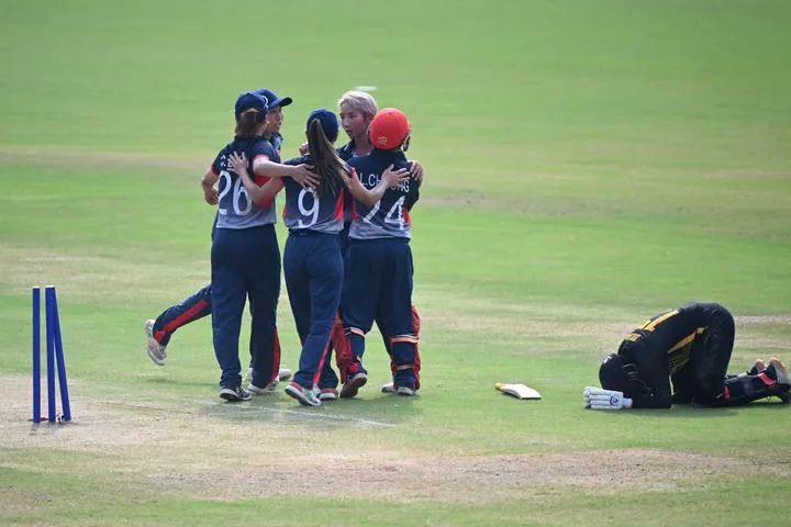 چین کے صوبہ ژی جیانگ میں 19ویں ایشین گیمز میں چین کے ہانگ کانگ اور ملائیشیا کے درمیان خواتین کے کرکٹ کے ابتدائی راؤنڈ گروپ بی کے میچ کے دوران چین کے ہانگ کانگ کی کھلاڑی جشن منا رہی ہیں۔(شِنہوا)