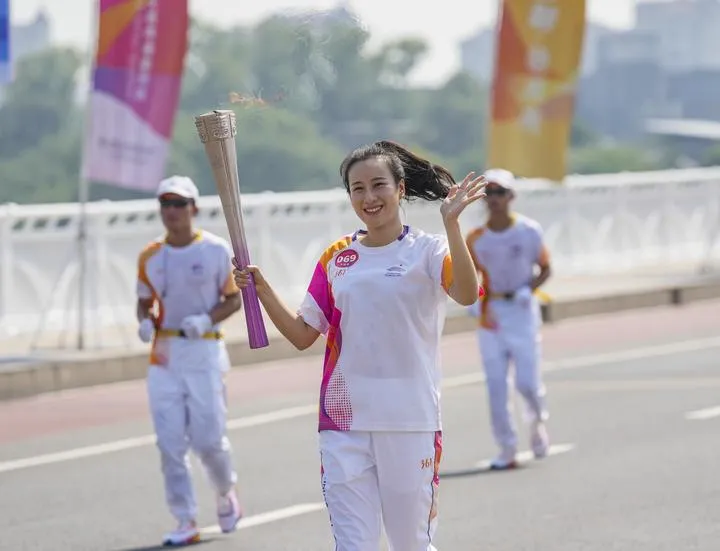 چین کے مشرقی صوبہ ژی جیانگ کے چھوژو میں 19ویں ایشین گیمز کی مشعل ریلی کے دوران مشعل بردار چھن یوتنگ مشعل اٹھائے دوڑ رہی ہے۔(شِنہوا)