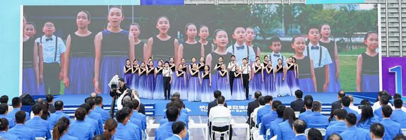 چین ، مشرقی صوبہ ژے جیانگ کے شہرہانگ ژو میں ہانگ ژو ایشیائی گیمز ویلج کی افتتاحی تقریب میں بچے 19 ویں ایشیائی کھیلوں کا گیت " دی لو وی شیئر" پیش کررہے ہیں۔ (شِنہوا)