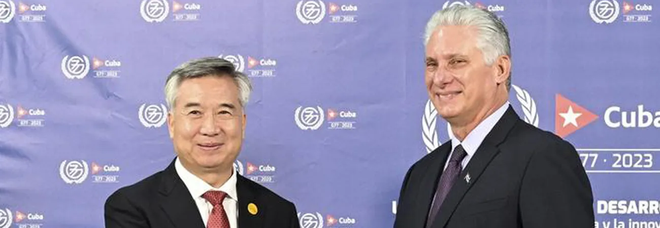 کیوبا کے صدر میگوئل ڈیاز کینیل ہوانا میں گروپ 77 (جی 77) کے سربراہ اجلاس سے قبل کمیونسٹ پارٹی آف چائنہ کی مرکزی کمیٹی کے سیاسی بیورو کی قائمہ کمیٹی کے رکن اور چینی صدر شی جن پھنگ کے خصوصی نمائندے لی شی کا استقبال کررہےہیں۔(شِنہوا)