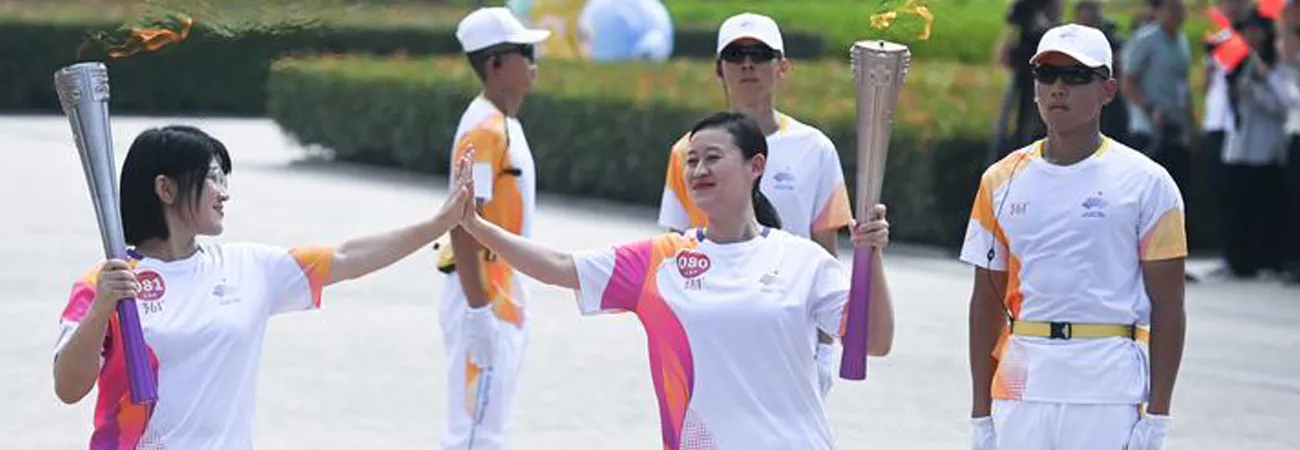 چین ، مشرقی صوبہ ژے جیانگ کے شہر جیاشنگ میں 19 ویں ایشیائی کھیلوں کی مشعل ریلی کے دوران مشعل بردار یوآن جنگ (دائیں) اور ژو ہوجیانگ کا تصاویر کے لئے انداز۔ (شِنہوا)