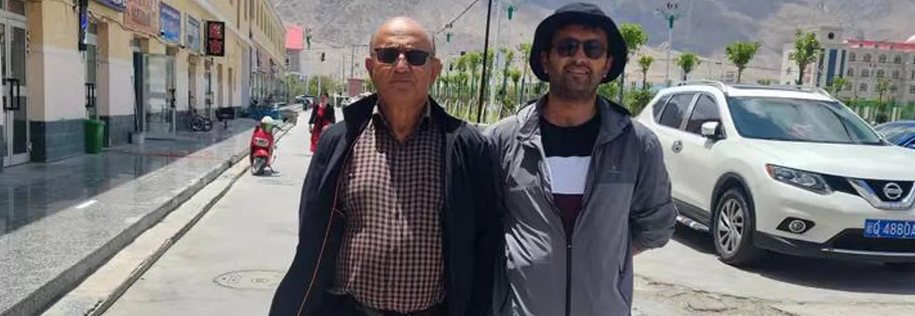 چین ، سنکیانگ کی ٹاشکورگان تاجک خوداختیار کاؤنٹی کی ایک سڑک پر پاکستانی کاروباری شخصیت بیگ سیف اللہ (بائیں) اور ان کے بیٹے کا گروپ فوٹو۔ (شِنہوا)