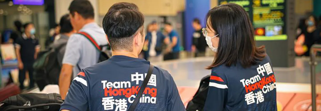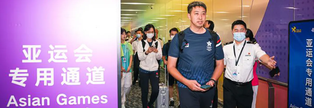 چین ، ہانگ ژو میں آمدہ 19 ویں ایشیائی کھیلوں میں شرکت کے لئے شیاؤ شان بین الاقوامی ہوائی اڈے پر پہنچنے والے چین کے ہانگ کانگ کے دستہ کے ارکان کو دیکھا جاسکتا ہے۔ (شِنہوا)
