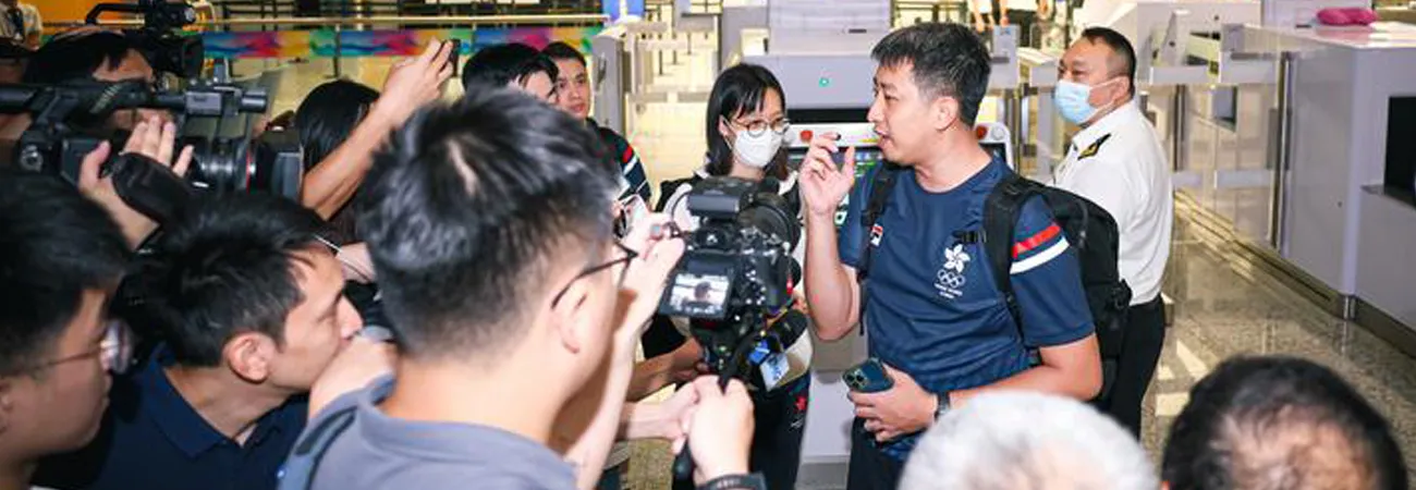 چین ، ہانگ ژو میں آمدہ 19 ویں ایشیائی کھیلوں میں شرکت کے لئے شیاؤ شان بین الاقوامی ہوائی اڈے پر پہنچنے والے چین کے ہانگ کانگ کے دستہ کا ایک رکن انٹرویو دے رہا ہے۔ (شِنہوا)
