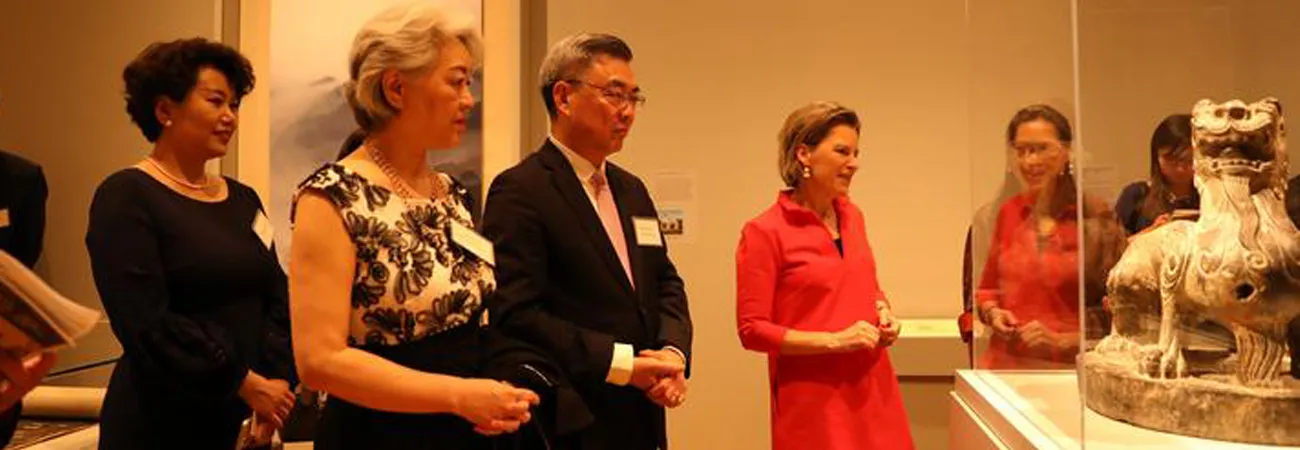 امریکہ ، نیویارک میں چینی قونصل جنرل ہوانگ پھنگ (درمیان) امریکی ریاست اوہائیو کے شہر کلیولینڈ کے کلیولینڈ میوزیم آف آرٹ میں چین کے دریائے یانگسی طاس کے خزانوں پر مشتمل ایک نمائش دیکھ رہے ہیں۔ (شِنہوا)