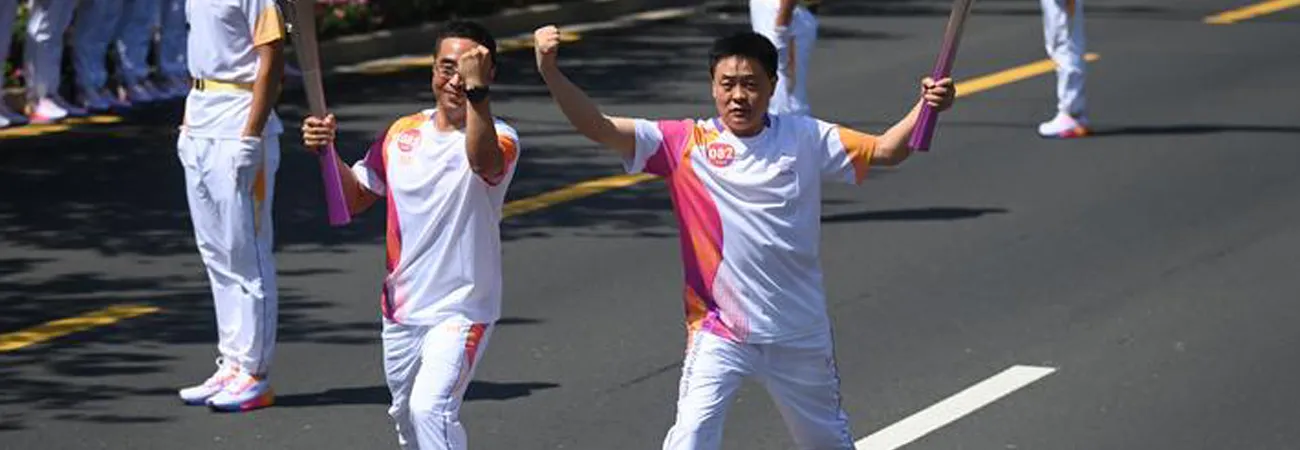 چین کےمشرقی صوبہ ژی جیانگ کے شہر ہوژو میں 19ویں ایشین گیمز کے مشعل بردار ژؤ چُھن لونگ (بائیں) اور لیو شیاووی مشعل ریلی کے دوران تصویر بنوا رہے ہیں۔(شِنہوا)