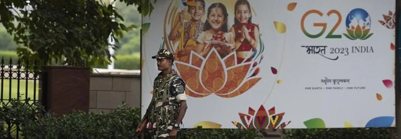 بھارت کے شہرنئی دہلی میں گروپ آف 20 (جی 20) سربراہ اجلاس کےلوگو کے قریب ایک بھارتی نیم فوجی دستے کا اہلکار پہرہ دے رہا ہے۔(شِنہوا)