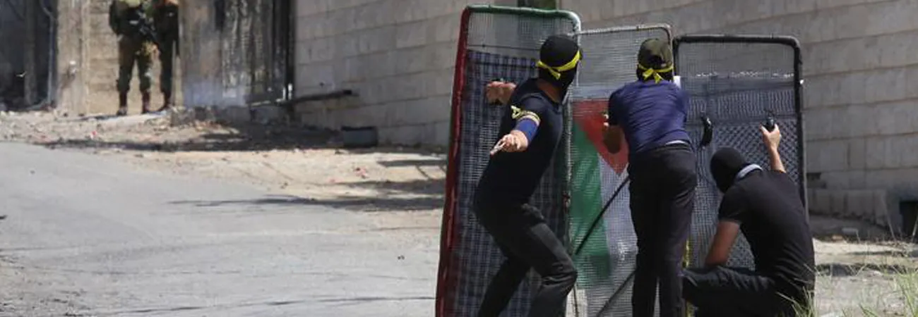نابلس کے قریب مغربی کنارے کے گاؤں کفر قدوم میں یہودی بستیوں کی توسیع کے خلاف احتجاج کے بعد جھڑپوں کے دوران مظاہرین میں سے ایک فلسطینی شہری اسرائیلی فوجیوں پر پتھراؤ کررہا ہے۔(شِنہوا)