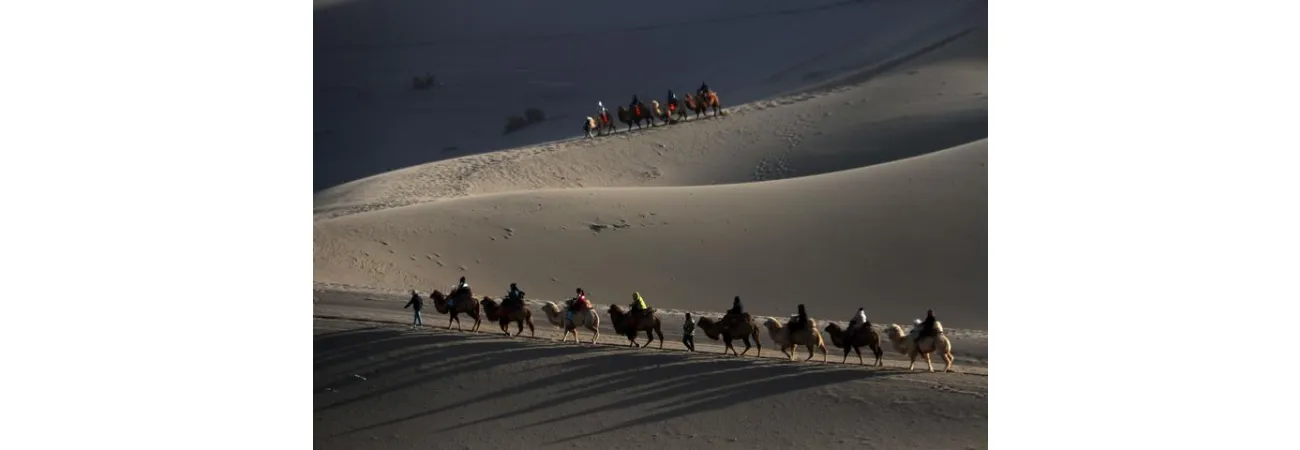 چین کے شمال مغربی صوبے گانسو کے علاقے ڈون ہوانگ میں سیاح منگ شاماؤنٹین اینڈ کریسنٹ اسپرنگ کے خوبصورت مقام کا دورہ کر رہے ہیں۔ (شِنہوا)