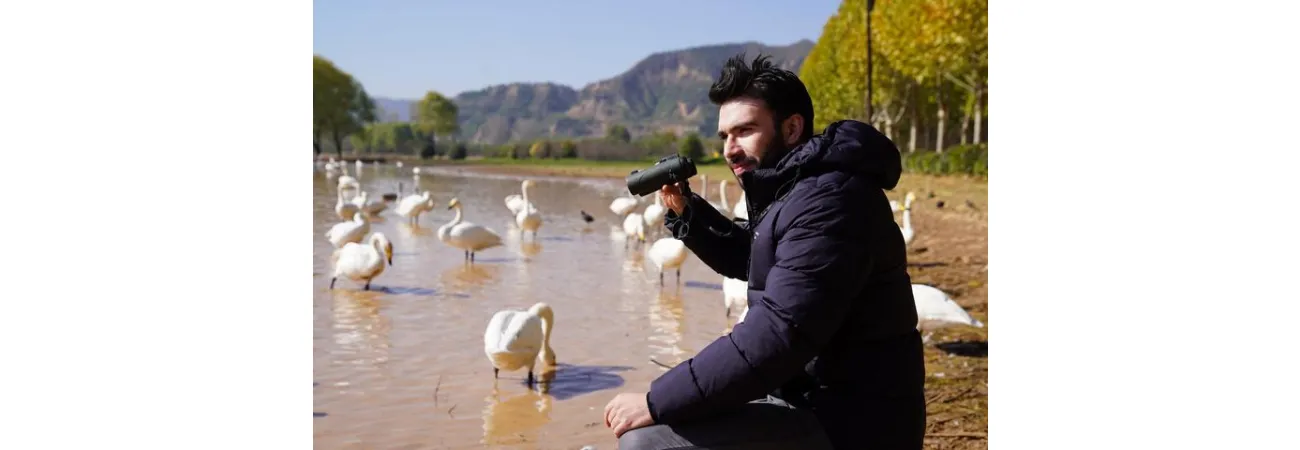 چین کے شمالی صوبے شنشی کی کاؤنٹی پھنگ لو میں پاکستانی طالب علم انیس الرحمان پرندوں کے لیے ماحول بہتر بنانے کی چینی کوششوں کے تناظر میں ہنس کا مشاہدہ کر رہے ہیں۔ (شِنہوا)