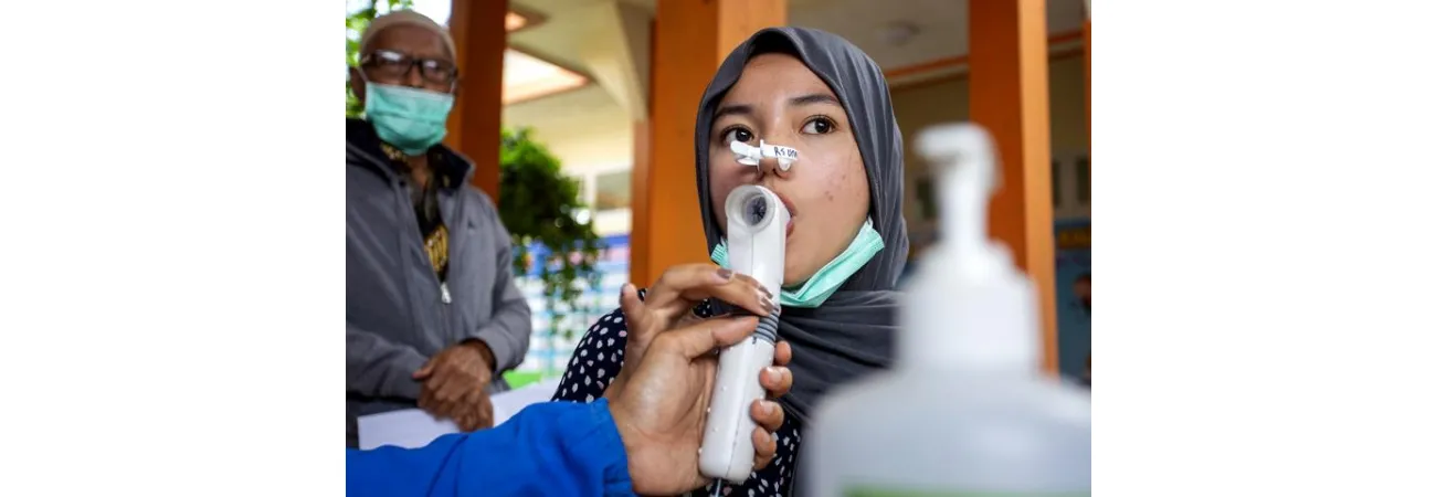 انڈونیشیا، مغربی سماٹرا کے ضلع آگام میں ماؤنٹ مراپی آتش فشاں کے پھٹنے کے بعد ایک خاتون سانس کے انفیکشن کا ٹیسٹ کرارہی ہے۔ (شِںہوا)