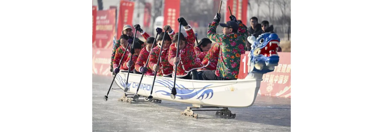 چین، شمال مغربی ننگ شیا ہوئی خود مختار خطے کے علاقے ین چھوان کے ایک پارک میں منعقدہ آئس ڈریگن بوٹ مقابلے میں لوگ مقابلہ کررہے ہیں۔ (شِنہوا)