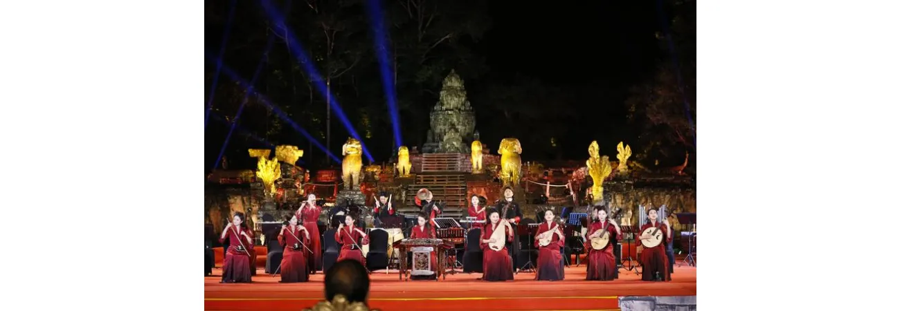 کمبوڈیا کے صوبے سیم ریپ میں کمبوڈیا- چین عوامی تبادلہ سال 2024 کی افتتاحی تقریب میں چینی فنکار فن کا مظاہرہ کر رہے ہیں۔ (شِنہوا)